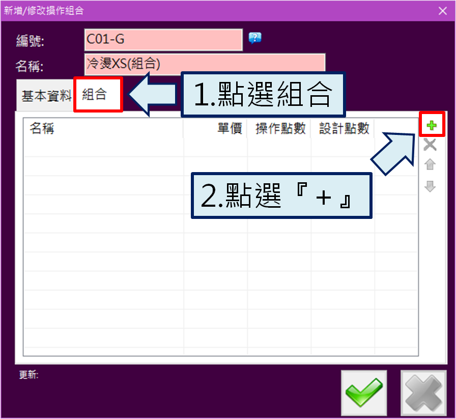 首先需確認所有需要用到的技術操作項目皆已建置完成,技術操作資料建置方式請參考此篇,接著即可開始建立操作組合