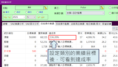 在「我的績效分析」報表中,除了可了解設計師個人的業績狀況與薪資試算外,還可以針對每一種「統計類別」設定目標業績,在【技術操作業績】、【技術操作點數】、【店販商品業績】這三個頁籤均可設定『達成率』,以確認是否達標