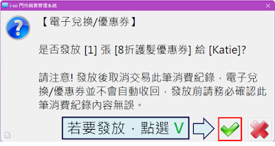 6.設定完成後,結帳時系統會依照您設定的發放規則判斷,在符合條件時詢問是否需要發放,您可以依照需求決定,若點選 V,系統即會自動發放電子優惠券給顧客